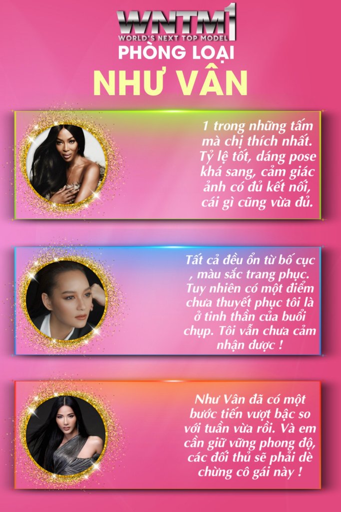 Naomi: cô gái này luôn giữ phong độ ổn định, shoot hình này tốt nhưng chưa sáng tạo trong cách posing nên chị mong là trong các thử thách tiếp theo Vân cần có sự lột xác hơn để giành FCO nếu có cơ hội đi tiếp.