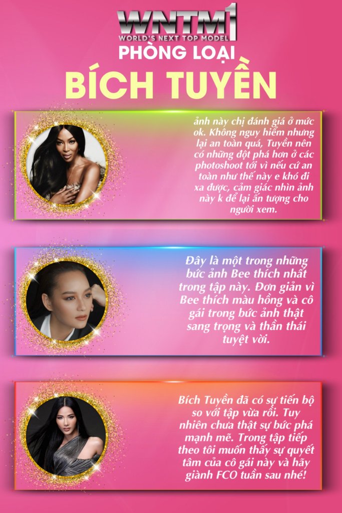 Naomi: thật ra hình này Tuyền đáng được điểm cao hơn nhưng chị phải cho em điểm thấp để em vực dậy, chị không thấy sự đột phá của em trong nhiều tuần rồi, nếu em không thoát ra khỏi giới hạn của bản thân thì em sẽ mãi mãi đứng sau các bạn khác và ra về.